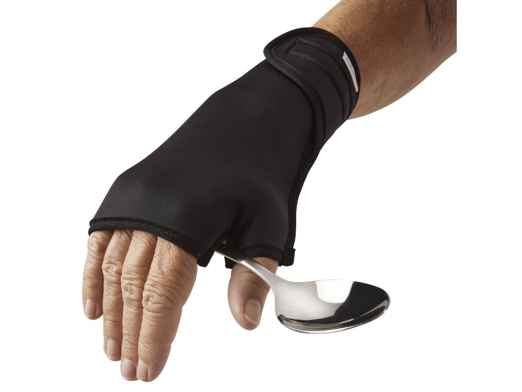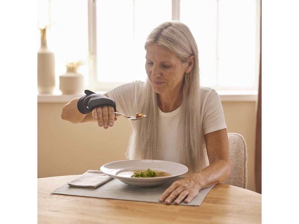 Rukavica sa jednoducho navlečie na ruku a upevní pomocou suchého zipsu. Do integrovaného úchytu s protišmykovým povrchom sa vloží lyžica, vidlička alebo iný príbor. Vďaka tomu zostáva príbor pevne uchopený bez potreby sily v prstoch.